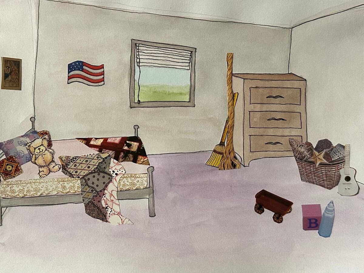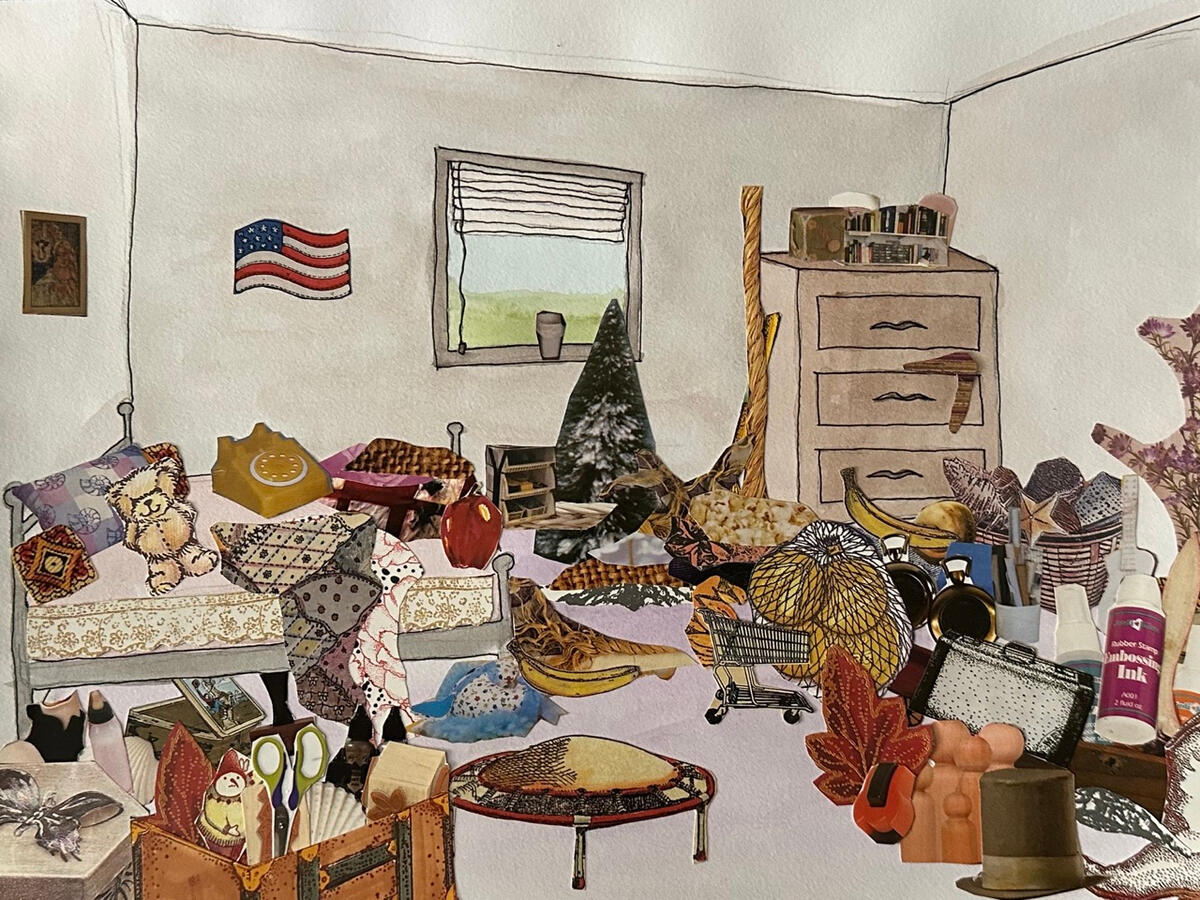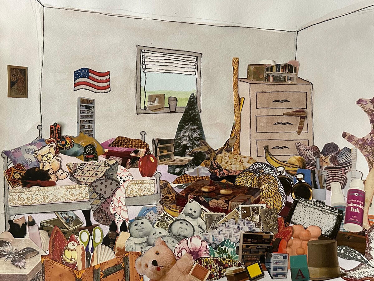 I think that actual pictures and videos of hoarded houses do little to represent my experience growing up–they create a spectacle, an image that people can look at in awe and think: how could you live like that? I didn’t look at the hoard this way. I was familiar with it, it was home, it was normal. I didn’t look at it and see mounds of junk. I saw last Christmas’ decorations and my baby clothes and toys and crafts and vases with dried flowers I picked for my mom two summers before and my bed and my wardrobe and my life. I have tried drawing it to translate my view, but it only ends up looking like scribbles. This year, I got the idea to recreate it through collage, and after trying it out, I think that’s been my most successful attempt. So here’s my childhood bedroom, as the hoard grew throughout the years, how it looked through my eyes.